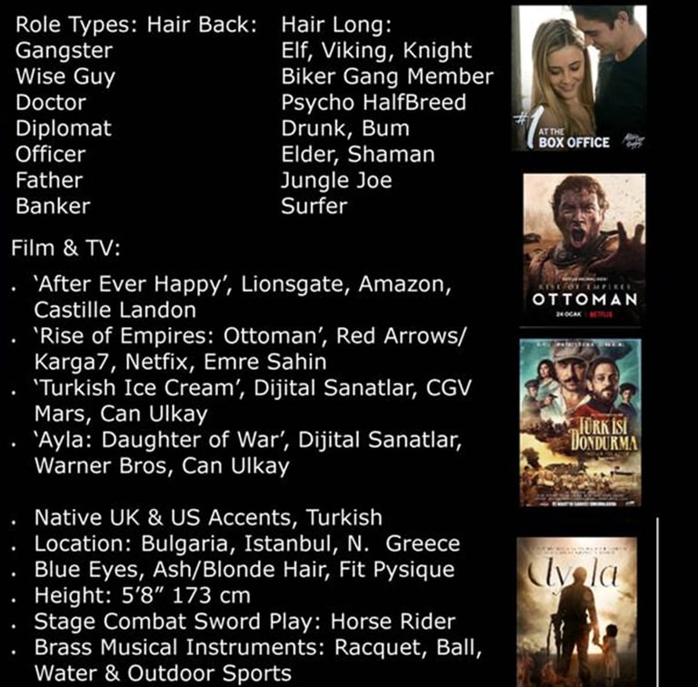 Often on sets in Istanbul, Turkiye; Sofia, Bulgaria,; Northern Greece & South East Europe......